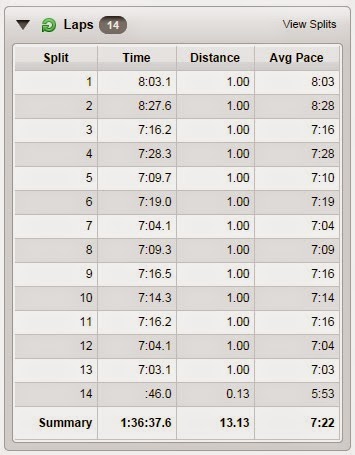At the midpoint of the race, I was consistently in the mid to low 7's, which felt relatively comfortable. I remember being surprised at the ease of the pace since I hadn't run much for the past 30 days. But for most of the summer, trained at 6:15-6:30 for my fall marathon that didn't happen, so I guess some of the quick leg turnover was still there. Looking back at Saturday, I have no doubt that I could have pushed the pace for most of the race to around 6:35-6:45. But even though it was only a half-marathon, I was scared to death of walking the last 3 or 4 miles. So for most of the day I would look down at my Garmin, noticing a quick pace, and slowing it way down to conserve energy. Hindsight being 20/20, I could have pushed it for a 1:32 or so at Longview.